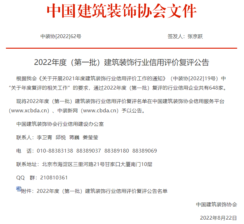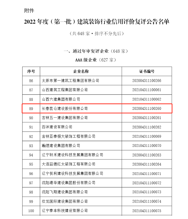 2022年8月22日,中国建筑装饰协会发布《2022年度(第一批)建筑装饰行业信用评价复评公告》,昆仑建设通过建筑装饰行业信用评价AAA级企业年审复评。