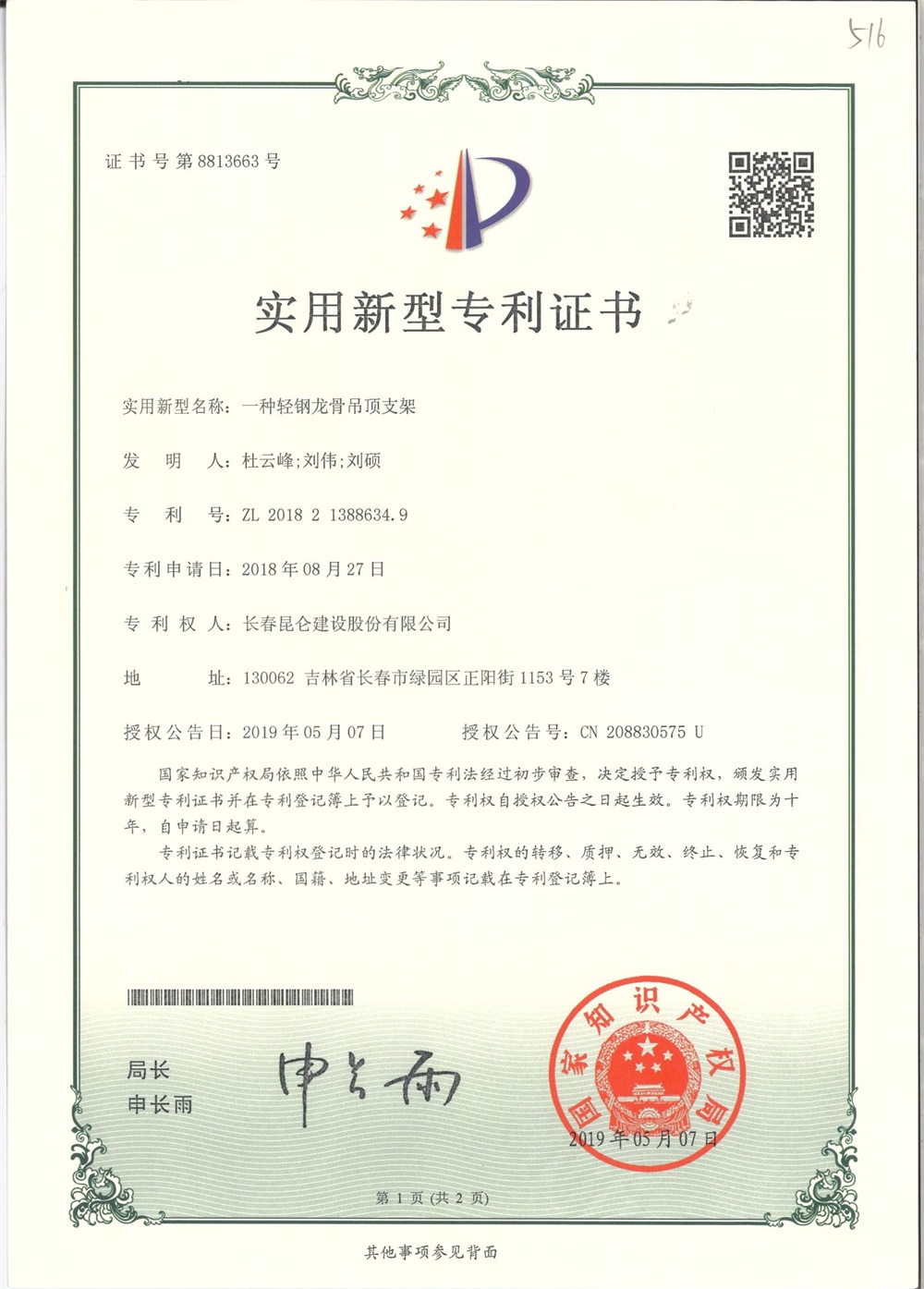 您当前的位置:首页 > 资质荣誉 > 专利证书 > 一种轻钢龙骨吊顶支架